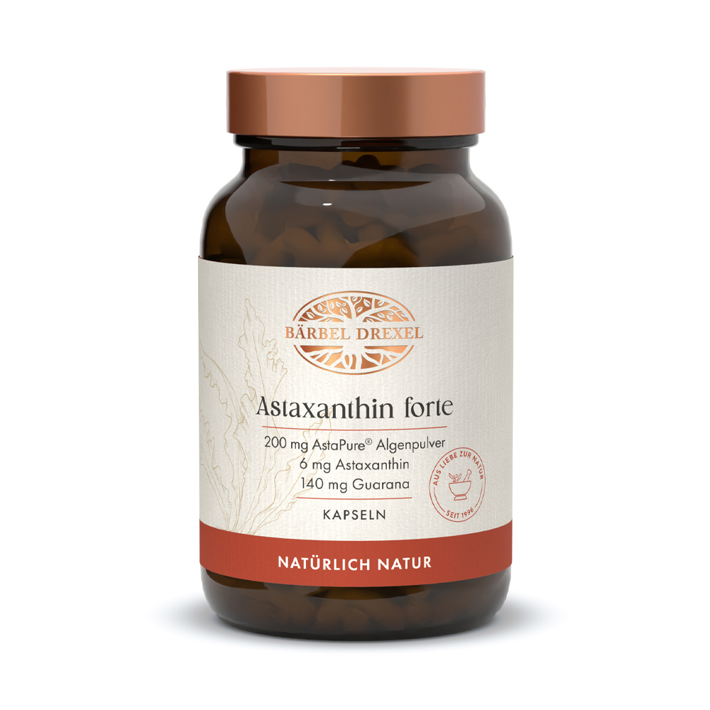 Die Astaxanthin forte Kapseln von Bärbel Drexel sind der Goldstandard unter den Astaxanthin-Präparaten. Sie vereinen jahrzehntelange Expertise im Bereich der Algen mit modernster Bioverfügbarkeitstechnologie. Die einzigartige Kombination aus Pulver und Extrakt enthält 6 mg hochwirksames Astaxanthin und ist mit energieförderndem Vitamin B6 sowie Guarana-Extrakt angereichert. Damit hebt sich das Produkt von den üblichen reinen Extraktformulierungen ab.