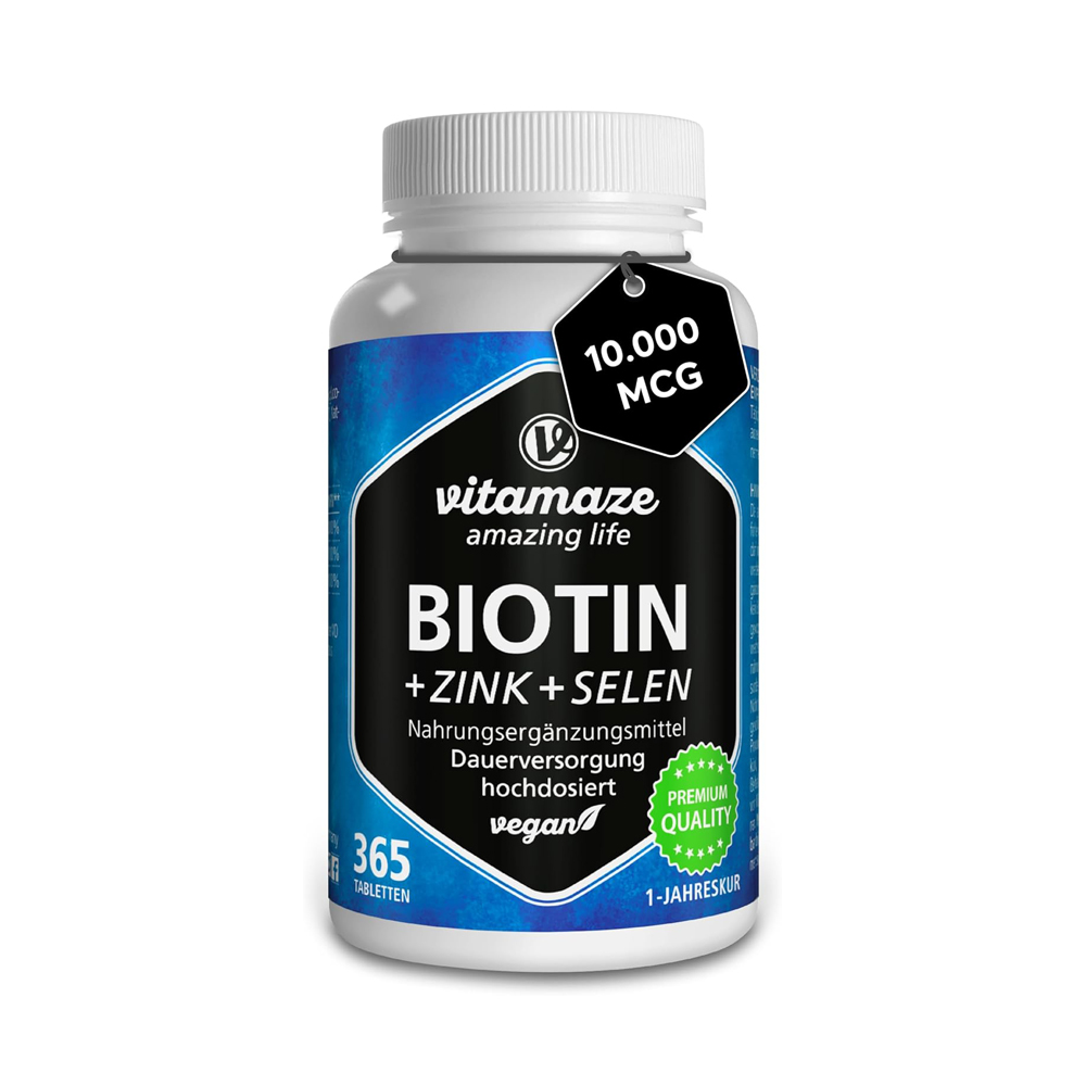 Vitamaze Biotin 10.000mcg, hochdosiert, 365 Tabletten, vegan. Was wie eine Aneinanderreihung von Attributen klingt, ist in Wahrheit ein solides und sehr beliebtes Nahrungsergänzungsmittel auf Basis von Biotin.