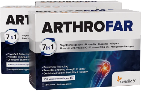Der 7-1-Komplex der ArthroFar-Gelenkkapseln aus dem Hause Sensilab basiert unter anderem auf einem Mix aus Kollagen, Curcumin, Hagebutte, Ingwer und Boswellin.