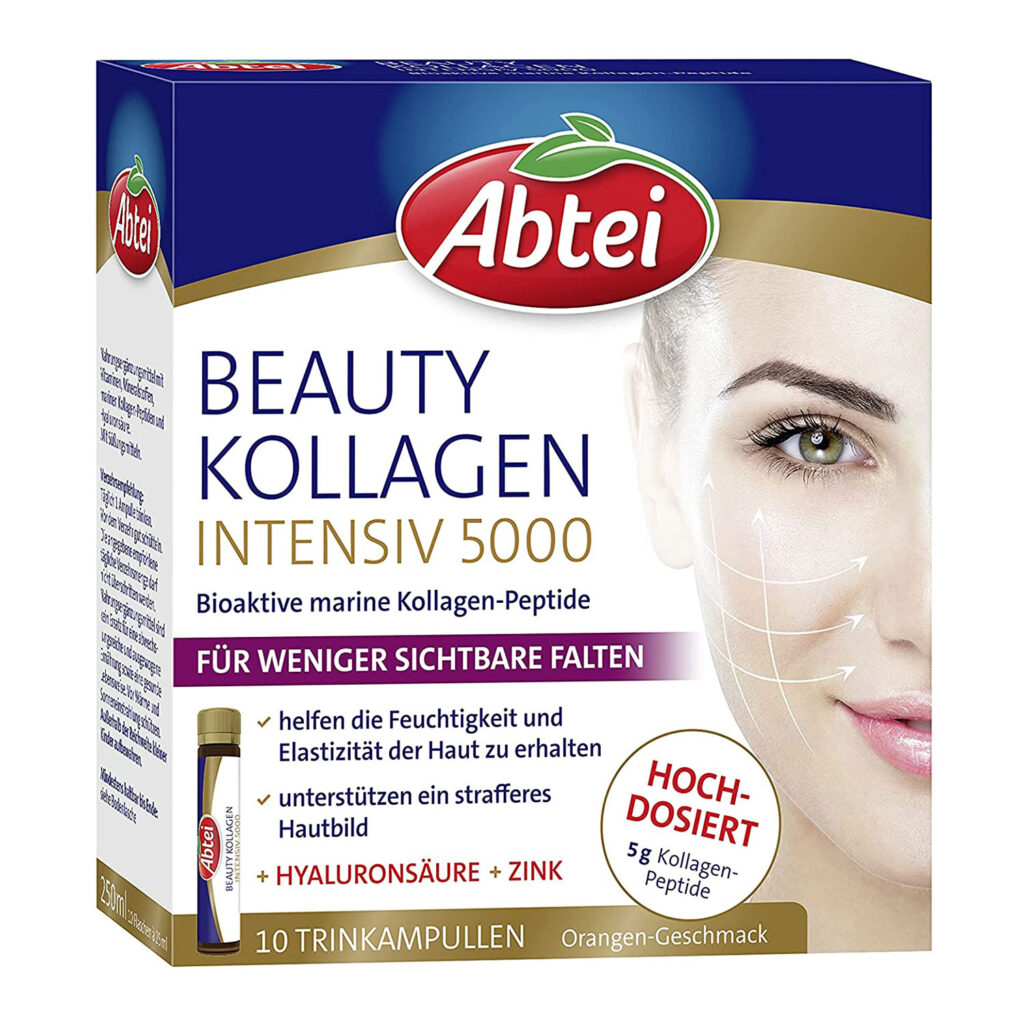 Abtei ist eine vielfach geschätzte Marke für Ergänzungsmittel. Das Abtei Beauty Kollagen intensiv enthält 10 Trinkampullen mit jeweils 5 Gramm marinem Kollagen aus Fisch.