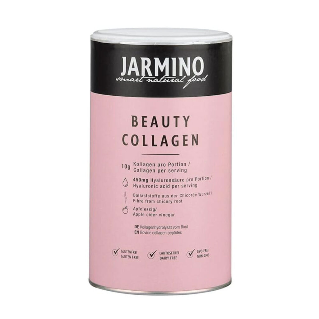 Das Jarmino Beauty Collagen ist ein Pulver mit Rinderkollagen. Als Pulver kann es in verschiedene Getränke oder Smoothies eingerührt werden. Pro Portion enthält es ganze 10 Gramm Kollagen vom Weiderind. Diese Rinder können bis zu 300 Tage im Jahr auf der Wiese grasen. Die Kollagenpeptide werden außerdem in Deutschland hergestellt, was ein großer Pluspunkt ist.